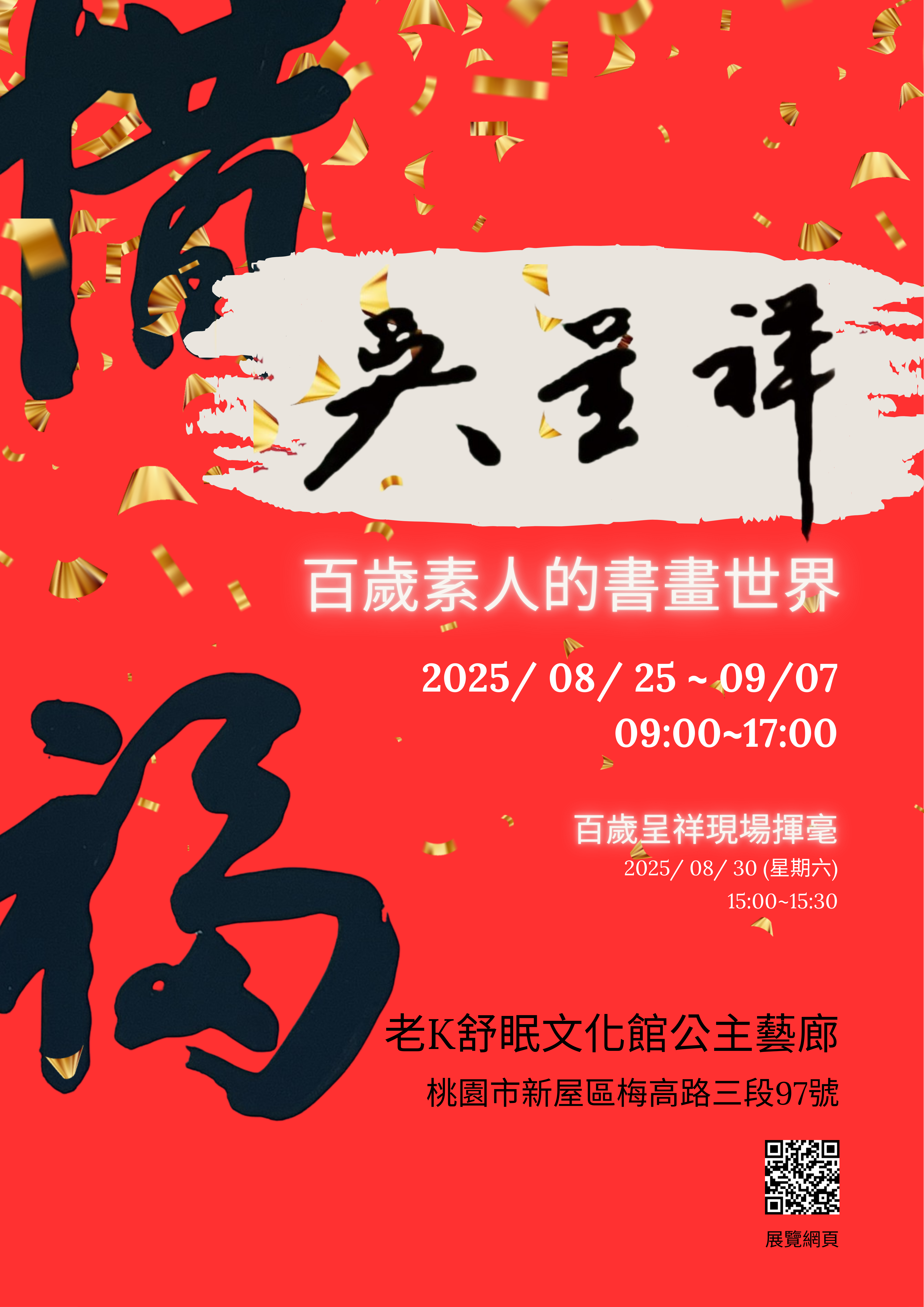 《 》 展覽日期:2025年8月25日至9月7日 展覽地點:桃園新屋老K舒眠文化館 百歲呈祥現場揮毫: 8月30日星期六下午 3:00 在桃園新屋的老K舒眠文化館,一場別具意義的書畫展正在展出——《吳呈祥:百歲素人的書畫世界》。這場展覽不僅是藝術的呈現,更是一段家族情感與生命歷程的深刻見證。 吳呈祥先生,生於民國15年,歷經戰亂與遷徙,從軍中退伍後以書法為伴,活出「學到老、活到老」的精神典範。從學習書法到成為書法老師,他以堅持與熱情走過漫長歲月。今年9月2日是吳先生百歲生日,子女們特別策劃這場個人展覽,作為百歲獻禮。 此次展出作品四十六件, 以書法為主,輔以少量水墨花鳥畫與山水畫,並展出他親手刻製的印章與海報字體設計稿。書法作品中有《心經》、治家格言,古詩文等,展現出吳先生對文字的深厚感情與持續探索的精神。最令人驚奇的是,儘管世伯並非基督徒,他竟也將《聖經》中的「愛」書寫入作,彷彿在筆墨之間,跨越宗教與文化的界線,回應人性最深層的情感。 值得一提的是,吳先生的創作材料極具實驗精神。他因節省而發揮創意,將月曆、壁紙、卡紙、油畫布、塑膠片、碎布料等廢棄物化為創作媒材,甚至在帽子與皮包上揮毫作畫。 他的作品是他生命的寄託與日常的痕跡。他的創作不拘形式、不限題材,正如他的人生,充滿包容與實驗的勇氣。 為了讓觀眾親身感受百歲書法家的風采,展覽期間將於8月30日星期六下午3:00舉辦特別活動——吳呈祥先生現場揮毫。屆時,吳先生將親自示範書法創作,展現他歷久彌新的筆力與精神風貌。誠摯邀請親友與社會大眾蒞臨觀賞,共同見證這場跨越世紀的書畫人生。 此次展覽亦延續了吳先生於2015年在老K舒眠文化館參與「書法老師聯合書法展」的精神,讓他的素人藝術之美再次被看見。從日常生活中孕育出的創作能量,不僅展現了他對書法的熱愛,也映照出他百歲人生的堅韌與豐厚。 我們誠摯邀請親友與社會大眾前來觀展,一同感受吳呈祥先生的生命力與創作熱情,在筆墨之間,體會一位百歲長者的藝術心境與人生智慧。